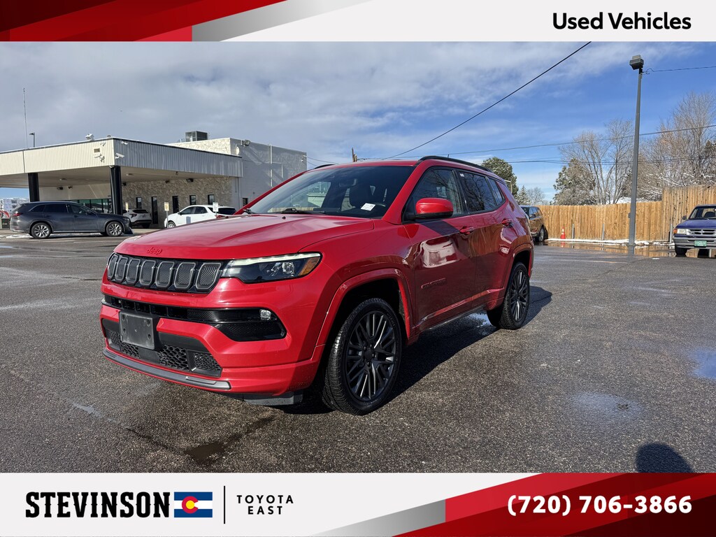 Stevinson Toyota East - STE is offering this 2022 Jeep Compass, Limited, in Redline Pearlcoat and Black Leather, only 60622 miles, Sunroof/Moonroof, Navigation/GPS/NAV, Heated Seats, Cooled Seat, Rear Back-Up Camera, Blue Tooth, 4WD, (RED) Edition, (RED) Package, 10.1 Touchscreen Display, 115V Auxiliary Power Outlet, 2nd Row Heated Seats, 2nd Row USB Type A/C Charge Only, 4G LTE Wi-Fi Hot Spot, Alexa Built-In, Body Color Door Claddings, Body Color Exterior Mirrors, Body Color Exterior Sill Moldings, Body Color Fascias, Body Color Wheel Flares, Bumpers: body-color, Cluster 10.25 TFT Color Display, Connected Travel & Traffic Services, Disassociated Touchscreen Display, Driver Seat Memory, Foot Activated Open 'N Go Liftgate, For Details, Visit DriveUconnect.com, For More Info, Call 800-643-2112, Global Telematics Box Module (TBM), Gloss Black Exterior Mirrors, Gloss Black Surround/Neutral Gray Rings, GPS Navigation, Gray Day Light Opening Moldings, HD Radio, Heated door mirrors, Highway Assist System, Integrated Voice Command w/Bluetooth, LED Low/Highbeam Projector Headlamps, Neutral Gray Exterior Accents, No Satellite Coverage HI/AK/PR/VI/GU, P&P Park & Unpark Assist System, ParkSense Fr/Rr Park Assist System, Power 2-Way Passenger Lumbar Adjust, Power 8-Way Adjust Front Passenger Seat, Power door mirrors, Power Front/Fixed Rear Full Sunroof, Power Liftgate, Premium Alpine Speaker System, Premium Leather Trimmed Bucket Seats, Premium LED Fog Lamps, Premium Taillamps, Radio: Uconnect 5 Nav w/10.1 Display, Reversible Carpet/Vinyl Cargo Mat, SiriusXM Guardian - Included Trial (B), SiriusXM Radio Service, SiriusXM Satellite Radio, SiriusXM w/360L, Traffic Sign Recognition, Universal Garage Door Opener, Ventilated Front Seats, Wireless Charging Pad.